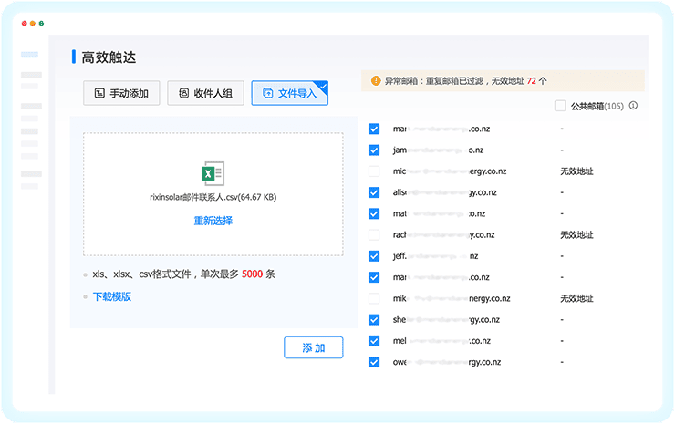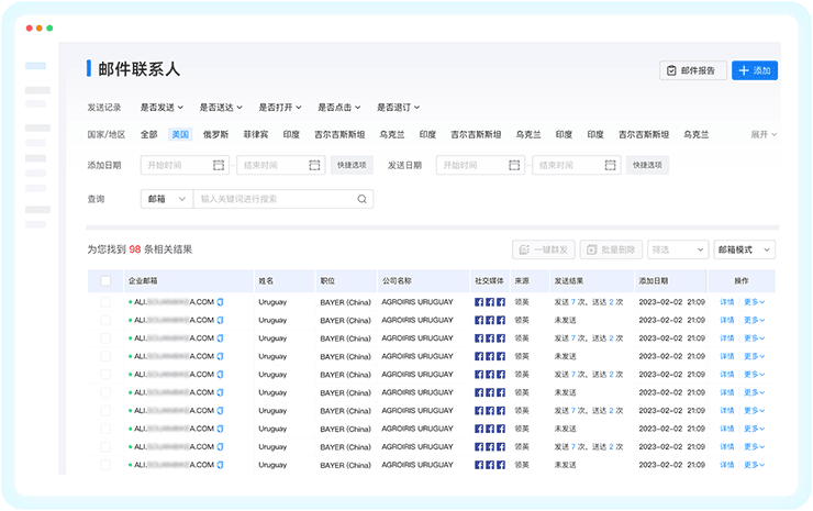 EVO视讯官网外贸通内置自动发送系统,根据需求智能分析投递线路,抵达率达90%以上;联系人管理、重要度匹配、无效邮箱过滤等功能,触达、跟进更高效